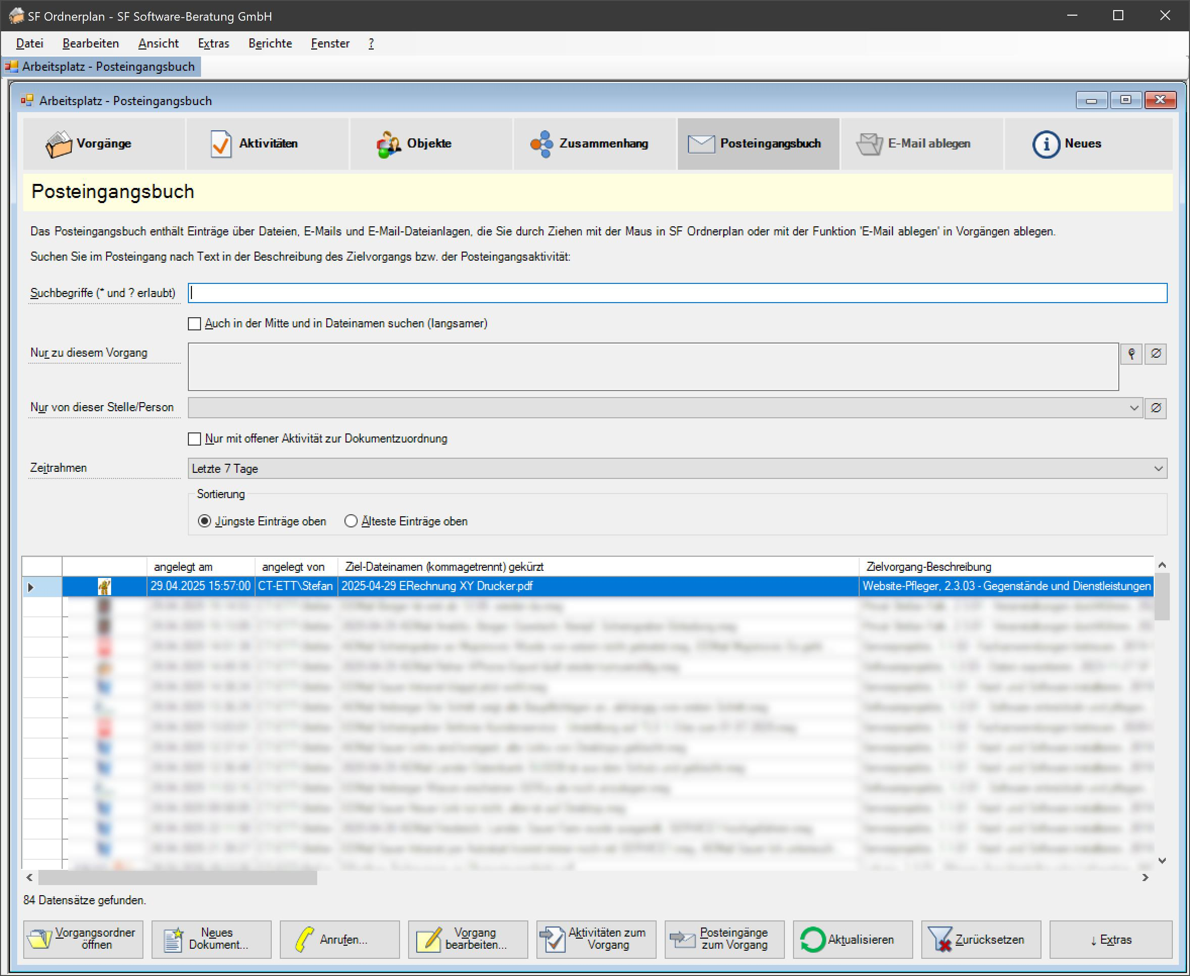 Das Posteingangsbuch ist durchsuchbar, und Sie können direkt von dort alles mit dem Ziel-Vorgang der Ablage tun, was Sie mit einem Vorgang tun können: Den Vorgangsordner öffnen, Aktivitäten prüfen usw.