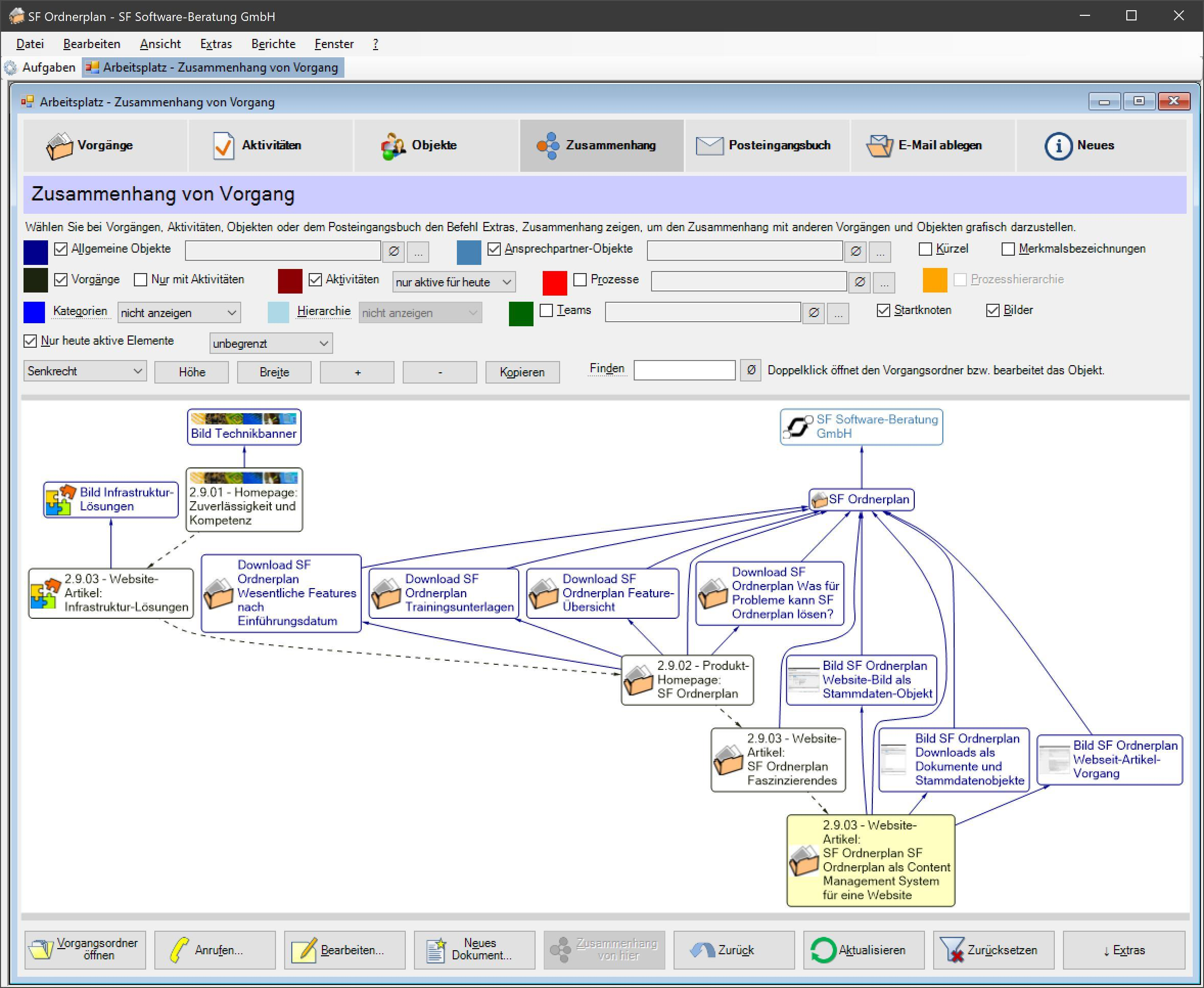 Ganz einfach - lassen wir doch in SF Ordnerplan ein Zusammenhang-Diagramm anzeigen, z.B. vom Vorgang dieses Beitrags aus, den Sie gerade lesen:
